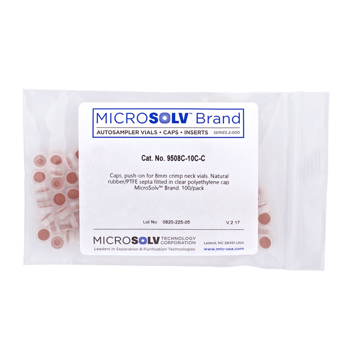 Caps, Push Top, with Natural Rubber / PTFE Septa, fitted in smooth, polyethylene, Natural Transparent Caps. For use with 8mm, Crimp Top autosampler vials. MicroSolv Brand. 100/PK.