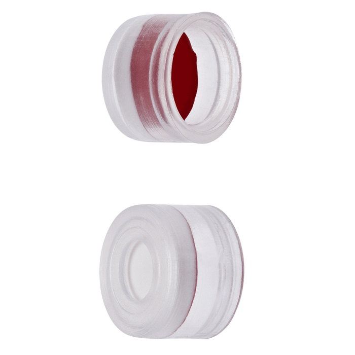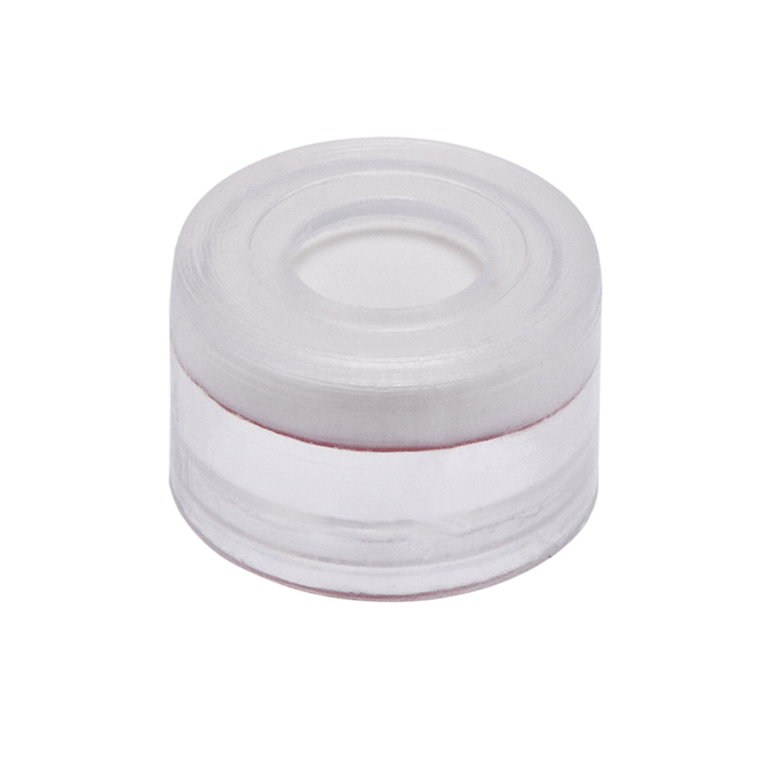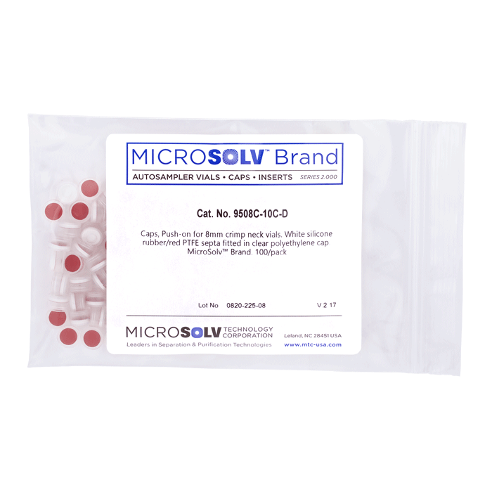 Caps, Push Top, with Silicone Rubber / PTFE Septa, fitted in smooth, polyethylene, Natural Transparent Caps. For use with 8mm, Crimp Top autosampler vials. MicroSolv Brand. 100/PK.