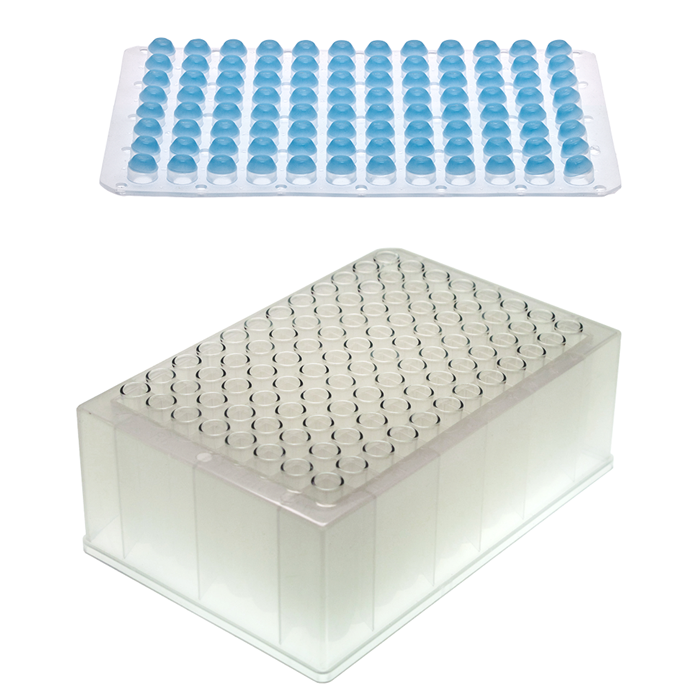 This kit consists of 1 Polypropylene, 96 Well Plate, 96 Borosilicate Glass Inserts and 1 Pre-Slit, Silicone Rubber / PTFE Sealing Mat. Very inert, this kit can be used with aqueous buffers or organic solvents.