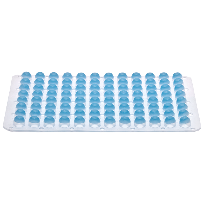This Sealing Mat has a PTFE coating that faces the plate and seals 96 Glass Inserts in a 96 Well Plate configuration. The Mat is Pre-Slit for easy penetration by auto-injectors and the bottoms are wells for better sealing.
