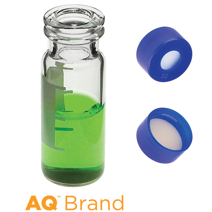 Vial & Cap Kit includes 100 EA 2ml, Snap Top, Clear Autosampler Vials with Write-On Patch and fill lines and 100 EA matching Snap Caps with Tan Silicone Rubber / White PTFE Septa fitted in the Blue Caps. AQ Brand Easy Purchase Pack. 1/PK.