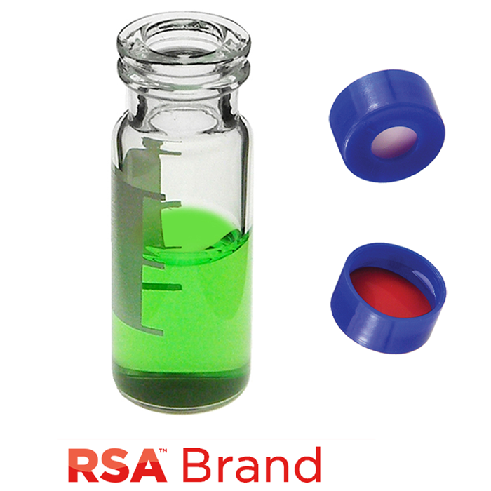 Vial & Cap Kit includes 100 EA 2ml, Snap Top, Clear RSA™ Autosampler Vials with Write-On Patch and fill lines and 100 EA matching Snap Caps with Silicone Rubber / PTFE Septa, fitted in the Blue Caps, RSA Brand Easy Purchase Pack. 1/PK.