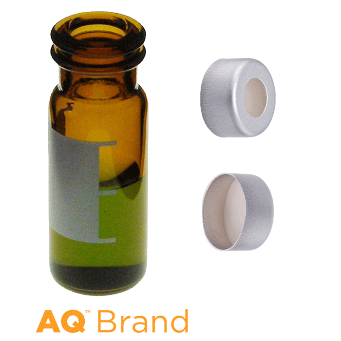 Vial & Cap Kit includes 100 EA 2ml, Snap / Crimp Top, Amber Autosampler Vials with Write-On Patch and fill lines and 100 EA matching Crimp Caps with Clear AQR Silicone Rubber / Clear PTFE, ultra-pure Septa, fitted in the Silver Caps. AQ Brand Easy Purchase Pack. 1/PK.