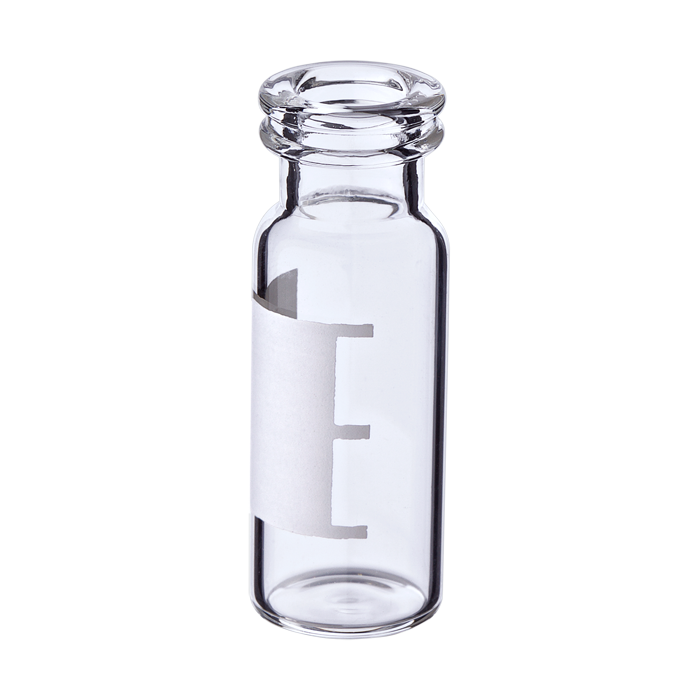 Vials, Snap Top, Glass. Clear, 2ml, with Write-On Patch and fill lines. An 11mm snap-ring and 12x32mm outer dimensions. For use as an autosampler vial. AQ Brand. 100/PK.