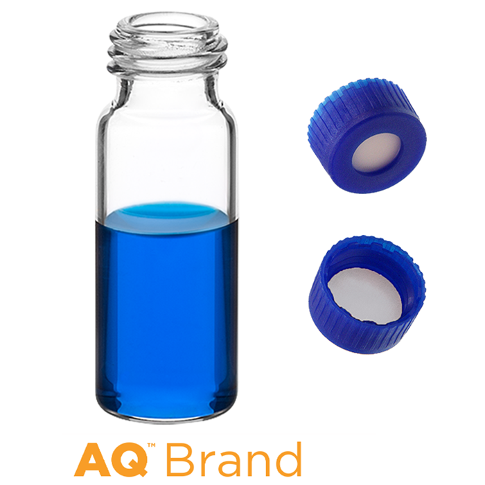 Vial & Cap Kit Includes 100 EA 2ml, Screw Top, Clear Autosampler Vials and 100 EA matching Screw Caps with Tan Silicone Rubber / White PTFE Septa bonded in the Blue Caps. AQ Brand Easy Purchase Pack. 1/PK.
