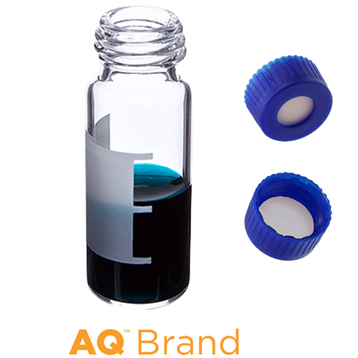 Vial & Cap Kit Includes 100 EA 2ml, Screw Top, Clear Autosampler Vials with Write-On Patch and fill lines and 100 EA matching Screw Caps with Tan Silicone Rubber / White PTFE Septa bonded in the Blue Caps. AQ Brand Easy Purchase Pack. 1/PK.