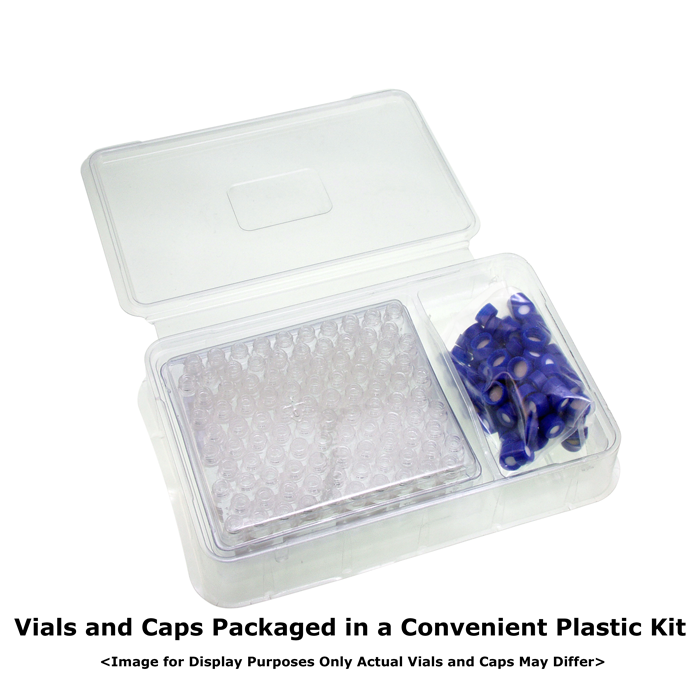 Vial & Cap Kit Includes 100 EA 2ml, Screw Top, Clear Autosampler Vials and 100 EA matching Screw Caps with Tan Silicone Rubber / White PTFE, Pre-Slit Septa bonded in the Blue Caps. AQ Brand Easy Purchase Pack. 1/PK.
