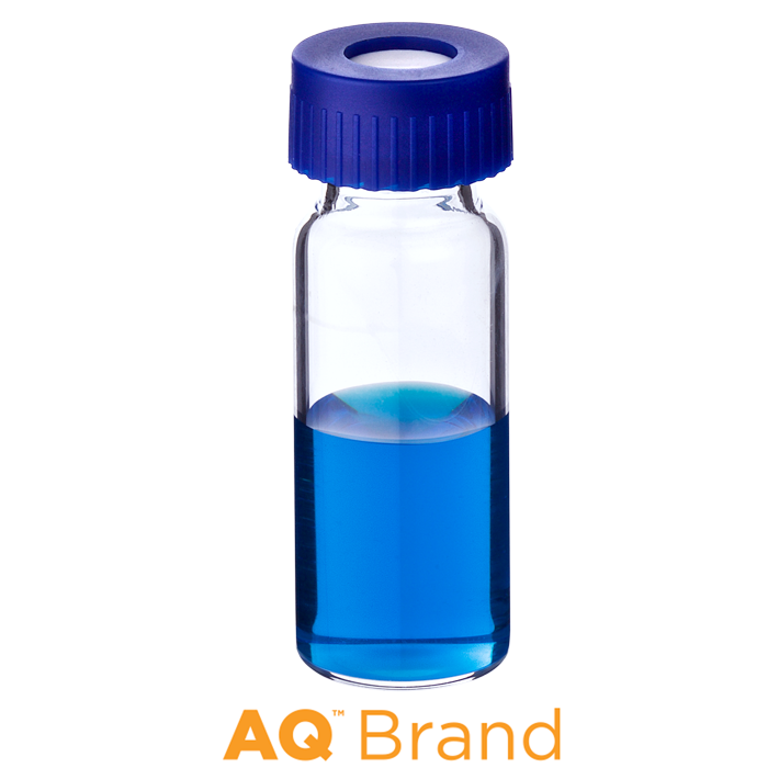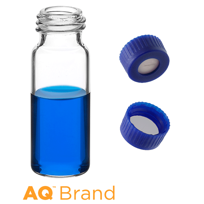 Vial & Cap Kit Includes 100 EA 2ml, Screw Top, Clear Autosampler Vials and 100 EA matching Screw Caps with Tan Silicone Rubber / White PTFE, Pre-Slit Septa bonded in the Blue Caps. Vials and Caps are Pre-assembled. AQ Brand Easy Purchase Pack. 1/PK.