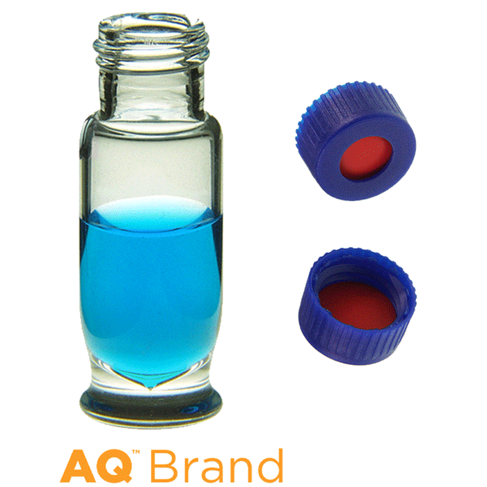 Vial & Cap Kit Includes 100 EA 1.8ml, Maximum Recovery, Screw Top, Clear Autosampler Vials and 100 EA matching Screw Caps with Red PTFE / White Silicone Rubber / Red PTFE Septa, bonded in the Blue Caps, AQ Brand Easy Purchase Pack. 1/PK.