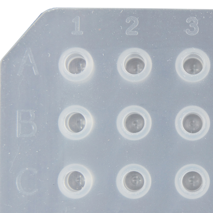 Made of ultra pure Silicone Rubber, this mat is designed and molded to seal up to 96 each 350ul Inserts in the U-2D Micro-Sample Management System. This mat is Pre-Slit and has alphanumeric markings on the top side of the mat, along the edges for identification of the Inserts.