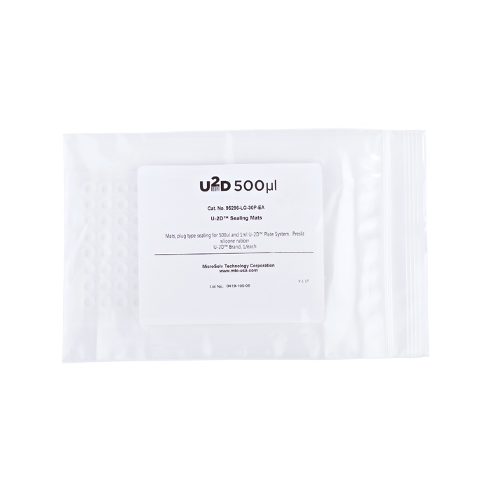 Mats are made of ultra pure Silicone Rubber, designed and molded to seal up to 96 each 500ul and 1ml Inserts in the U-2D Micro-Sample Management System. These mats are Pre-Slit and have alphanumeric markings on the top side of the mats, along the edges for identification of the Inserts. Use with Aqueous Solutions.