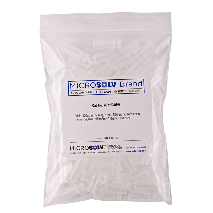 Vials, Snap Top, Plastic. Clear, 300ul MicroVial. An 11mm snap-ring and 12x32mm outer dimensions. For use as an autosampler vial. MicroSolv Brand. 100/PK.