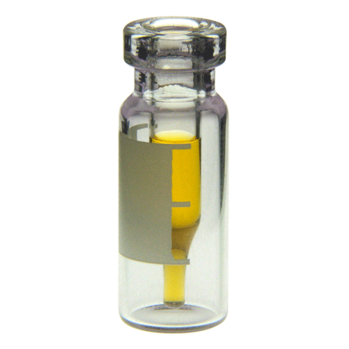 Vials and Inserts are made with first hydrolytic, Class A, Type-N51A Clear, Borosilicate Glass. The insert has a 300ul total fill volume and a 3ul residual volume for many autosamplers and autosampler needles. The Write-On Patch and fill lines are epoxy paint and will resist smearing when working with solvents.