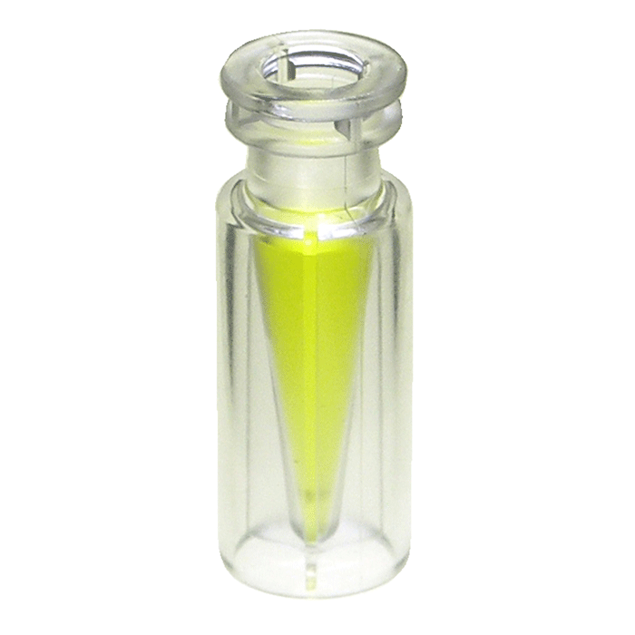 This narrow mouth, vial is manufactured with virgin, medical grade polymethylpentene which produces the visually clearest, translucent, built-in insert with a 300ul total fill capacity. Residual volume can be as low as 2ul depending on the autosampler and viscosity of samples used.