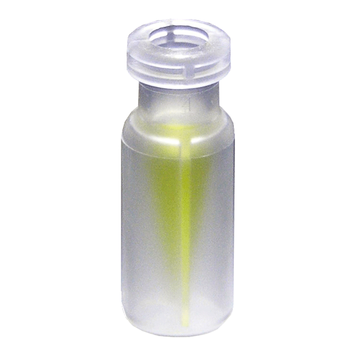 This narrow mouth vial is manufactured with ultra-pure, virgin, medical grade polypropylene and is translucent with a built-in insert that has 300ul total fill capacity. Residual volume can be as low as 2ul depending on the autosampler and viscosity of samples used.