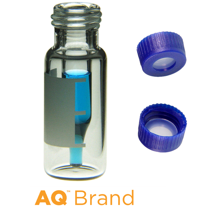 Vial & Cap Kit Includes 100 EA 300ul, Fused Insert, Screw Top, Clear Deactivated Autosampler Vials with Write on Patch and fill lines and 100 EA matching Screw Caps with Clear Silicone Rubber / Clear Tefzel, ultra-pure Septa, fitted in the Blue Caps. AQ Brand Easy Purchase Pack. 1/PK.