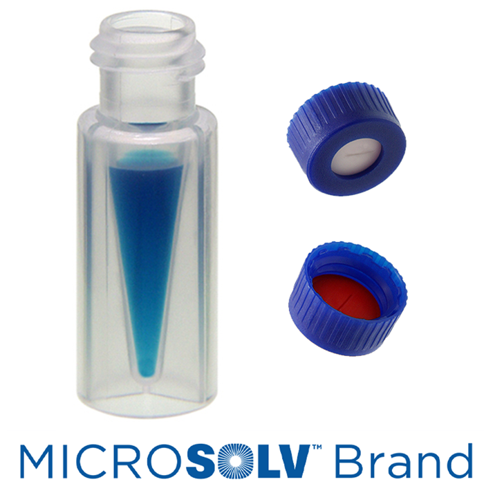 Vial & Cap Kit Includes 1000 EA 300ul, Screw Top, Clear polypropylene Autosampler Vials and 1000 EA matching Screw Caps with Silicone Rubber / PTFE Pre-Slit, Septa, bonded in the Blue Caps, MicroSolv Brand Easy Purchase Pack. 1/PK.