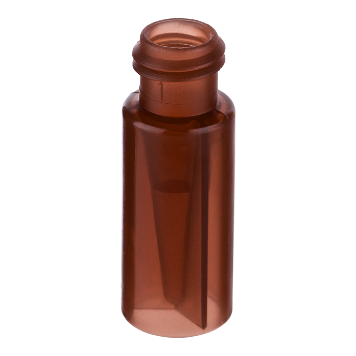 This narrow mouth, vial is manufactured with virgin, medical grade polypropylene and is amberized. The built-in insert has a 300ul total fill capacity. Residual volume can be as low as 2ul depending on the autosampler and viscosity of samples used.