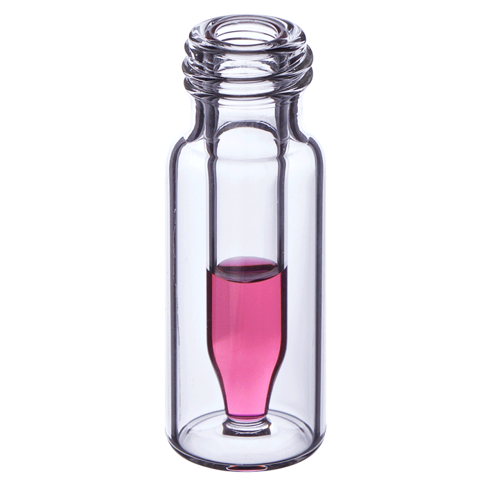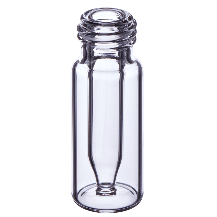 Vials, Screw Top, Glass. Clear / Clear Insert, 300ul Fused Insert™, 9-425mm threads, 12x32mm outer dimensions. For use as an autosampler vial. BASIK Brand. 100/PK.