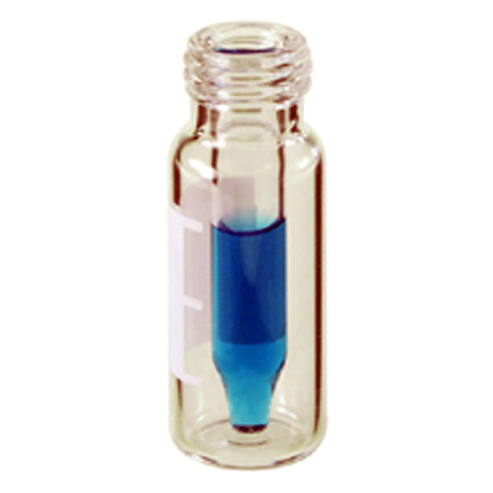 Vials and Wide Tip Inserts are made with first hydrolytic, Class A, Type-33 Clear, Borosilicate Glass. The insert has a 300ul total fill volume and a 4ul residual volume for many autosamplers and needles. The Write-On Patch and fill lines are ceramic and will resist smearing or scratching even when working with solvents.
