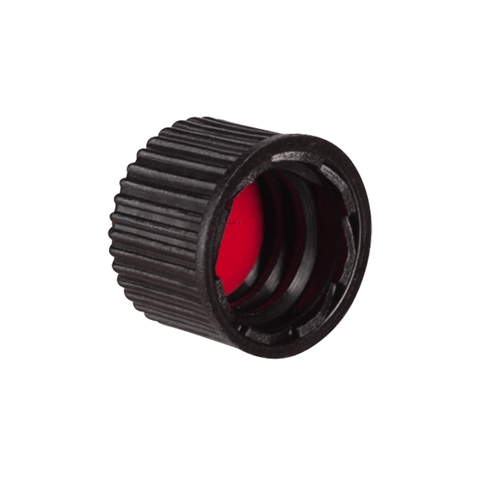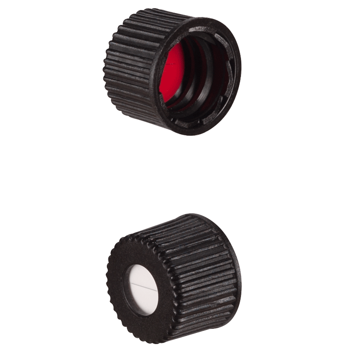 Caps, Screw Top, with 1.3mm thick Silicone Rubber / PTFE Pre-Slit Septa, fitted in "knurled", polypropylene, Black Caps with 5.5mm center holes. For use with 8-425mm thread, 12x32mm autosampler vials. BASIK Brand. 1000/CS.