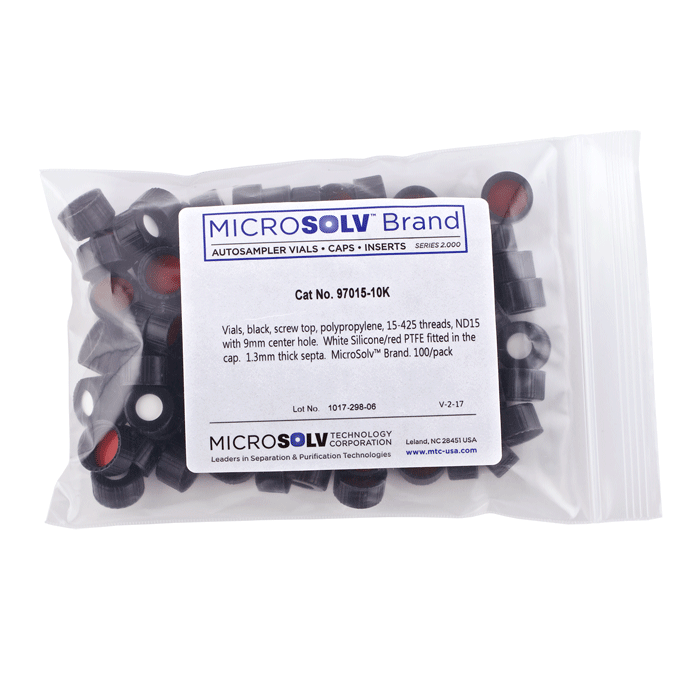 Caps, Screw Top, with White Silicone Rubber / Red PTFE Septa / Liner, fitted in knurled polypropylene, Black Caps. For use with ND15 thread, storage Vials or Bottles. MicroSolv Brand. 100/PK.