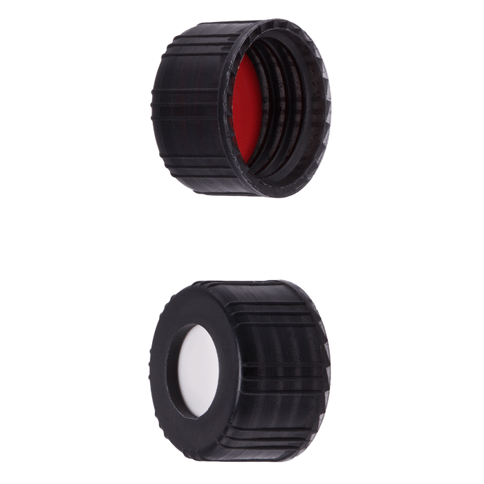 Caps, Screw Top, with White Silicone Rubber / Red PTFE Septa / Liner, fitted in knurled polypropylene, Black Caps. For use with ND15 thread, storage Vials or Bottles. MicroSolv Brand. 1000/CS.