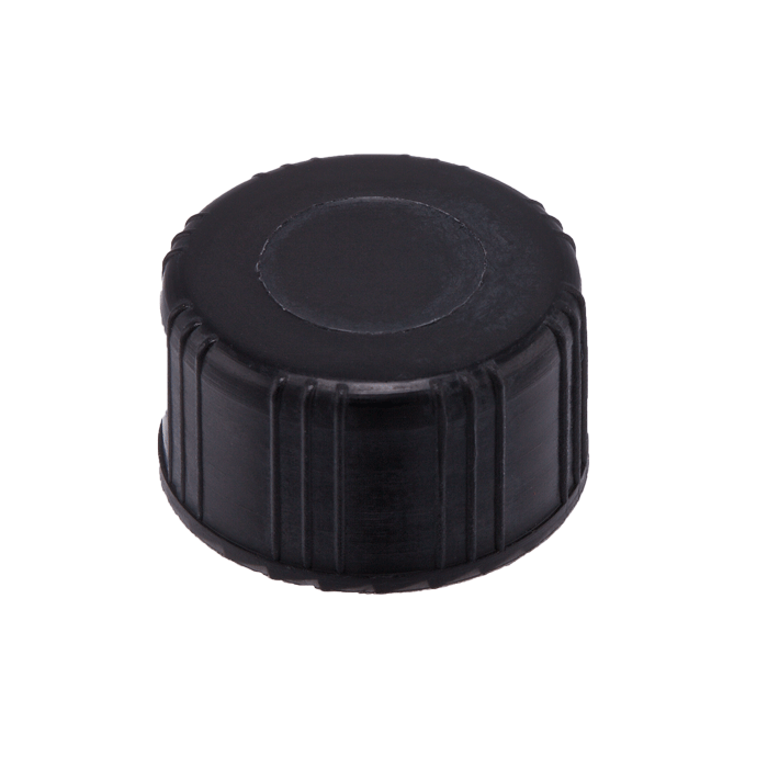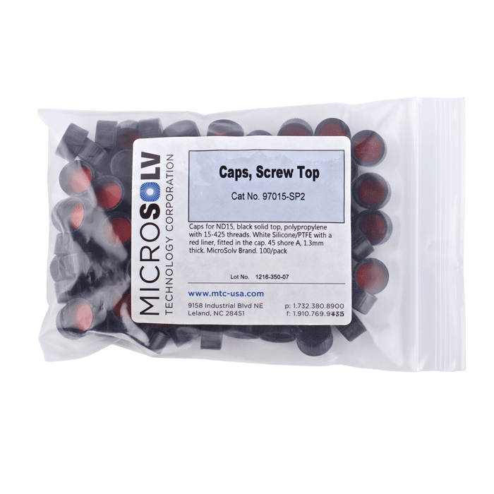 Caps, Screw Top, Solid, with White Silicone Rubber / Red PTFE Liner, fitted in knurled polypropylene, Black Caps. For use with ND15 thread, storage Vials or Bottles. MicroSolv Brand. 100/PK.