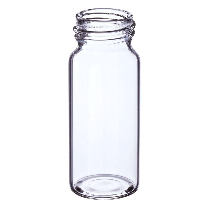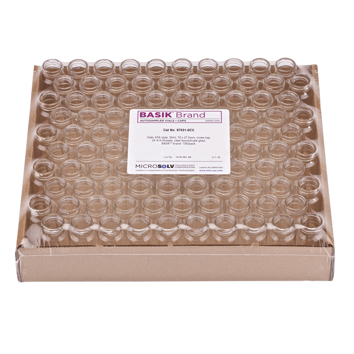 Vials, EPA Style, Glass. Clear, 30ml. 70x27.5mm outer dimensions. For use as an EPA test vial or storage bottle. ND24 threads. BASIK Brand. 100/PK.