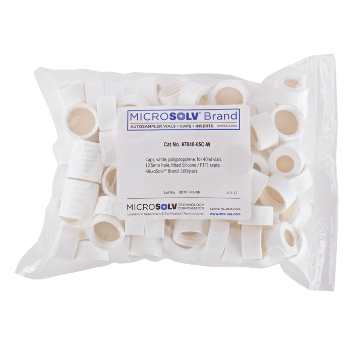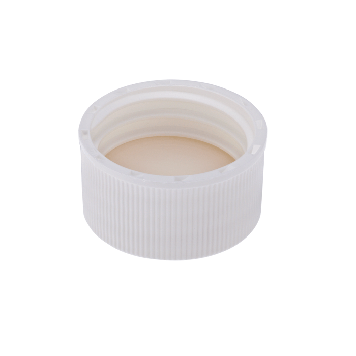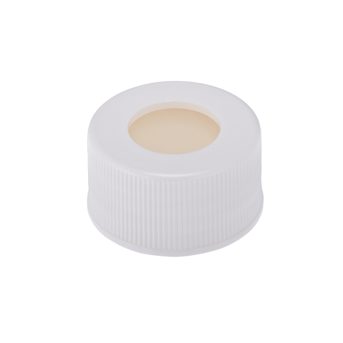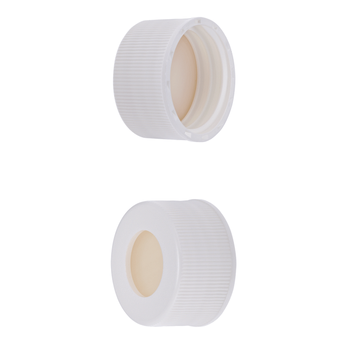 Caps, Screw Top, with White Silicone Rubber / White PTFE Septa, fitted in knurled polypropylene, White Caps. For use with 24-414mm threaded EPA Style vials. BASIK Brand. 100/PK.