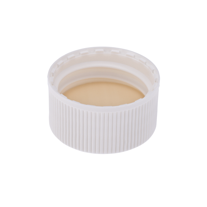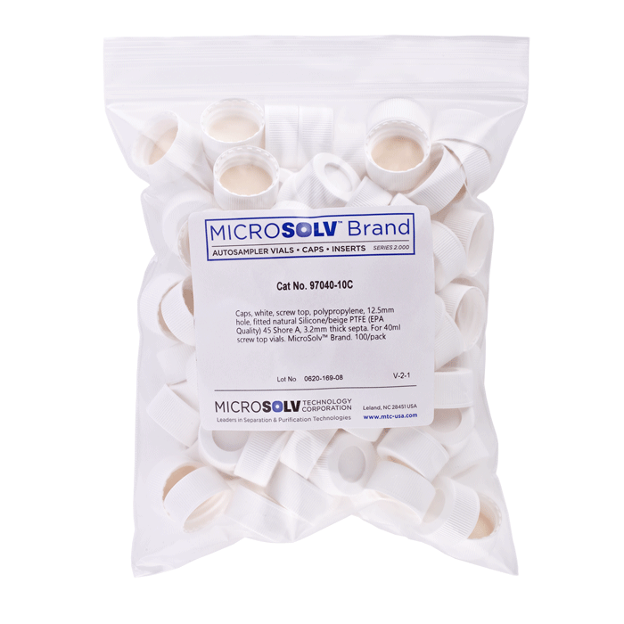 Caps, Screw Top, with White Silicone Rubber / Beige PTFE Septa, fitted in knurled polypropylene, White Caps. For use with 24-400mm threaded EPA Style vials. ND24 threads. MicroSolv Brand. 100/PK.