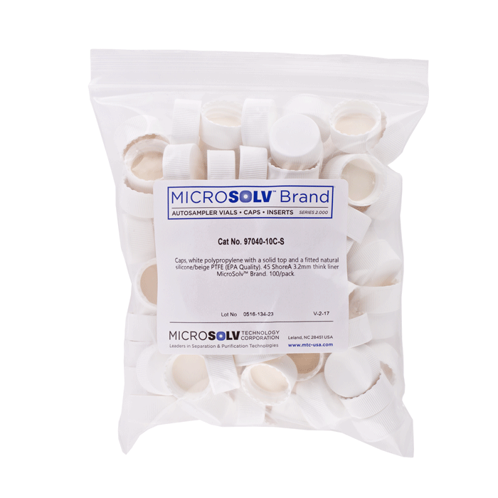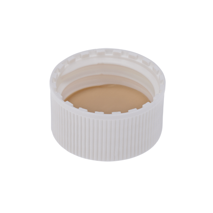 Caps, Screw Top, Solid, with White Silicone Rubber / Beige PTFE Liner, fitted in knurled polypropylene, White Caps. For use with 24-400mm threaded EPA Style vials. ND24 threads. MicroSolv Brand. 100/PK.