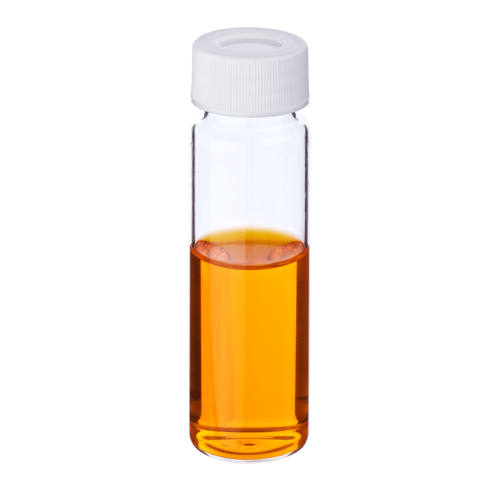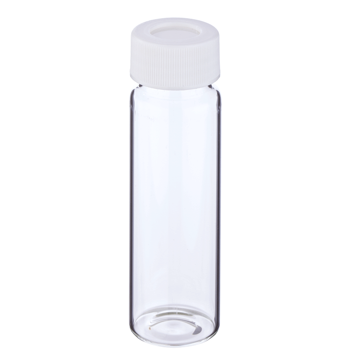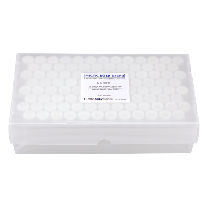 Vial & Cap Kit Includes 100 EA 40ml, Center Draining, Screw Top, Clear Autosampler Vials and 100 EA matching Screw Caps with Silicone Rubber / PTFE Septa fitted in the White Caps. Vials and Caps are Pre-assembled. MicroSolv Brand Easy Purchase Pack. 1/PK.