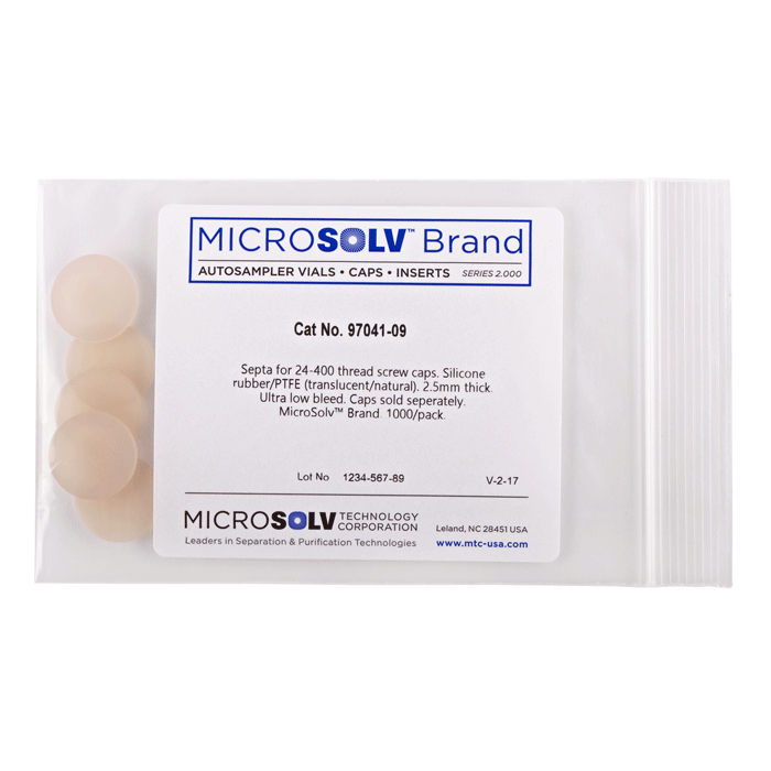 Septa, 22mm, Translucent Silicone Rubber / Natural PTFE. Ultra Low Bleed. For use in 24mm Caps, sold separately. BASIK Brand. 1000/CS.