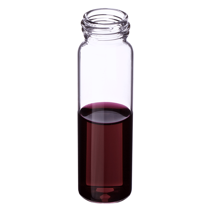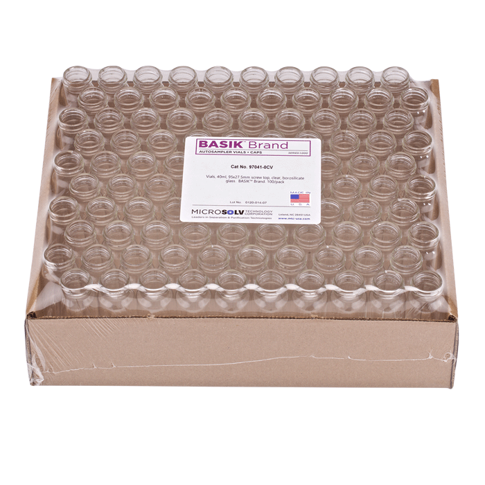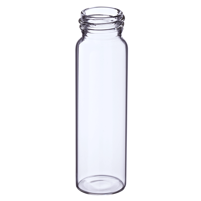 Vials, EPA Style, Glass. Clear, 40ml. 95x27.5mm outer dimensions. For use as an EPA test vial or storage bottle. ND24 threads. BASIK Brand. 100/PK.