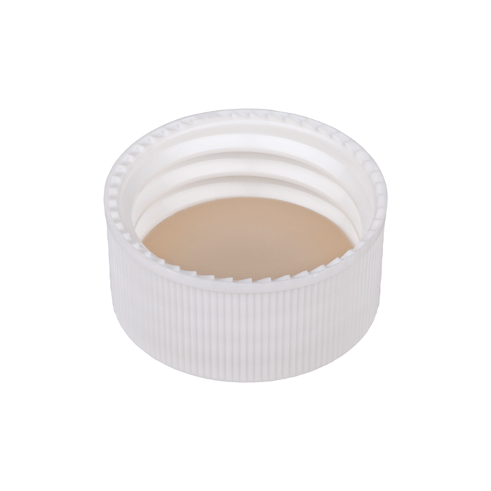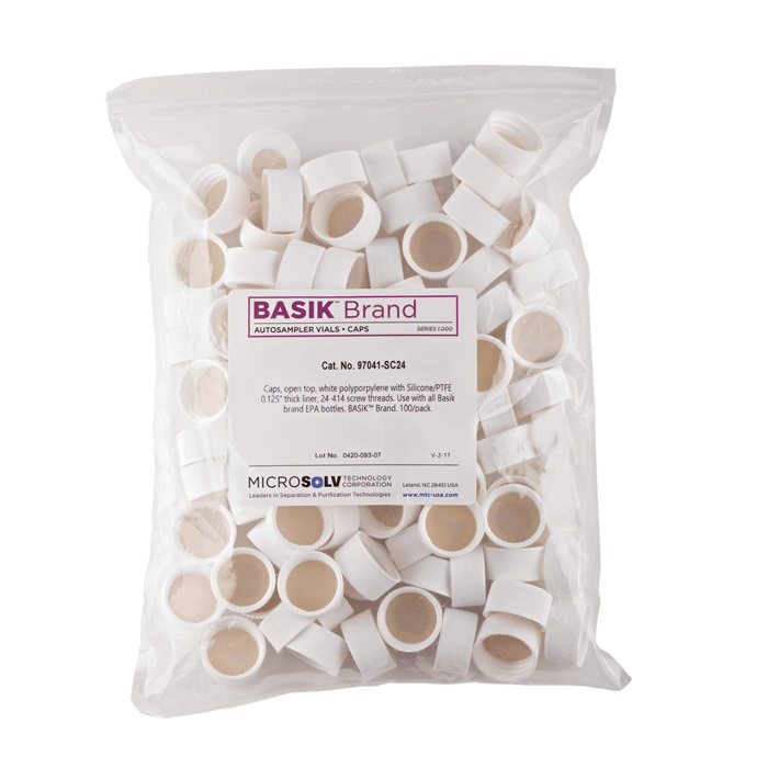 Caps, Screw Top, with Natural Silicone Rubber / Natural PTFE Septa, fitted in knurled polypropylene, White Caps. For use with 24-414mm threaded EPA Style vials. ND24 threads. BASIK Brand. 100/PK.