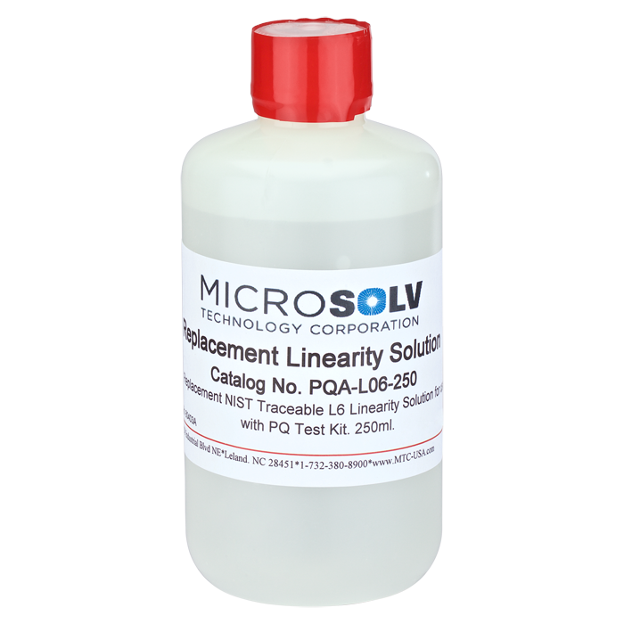 Use to test your HPLC or UV-vis detector for linearity precision and accuracy with the Chemical Solutions PQ or HSQ kits. This replacement solution is nominally labelled as Linearity L6 Solution and is NIST traceable. Supplied in a 250 mL plastic bottle and leak proof cap.