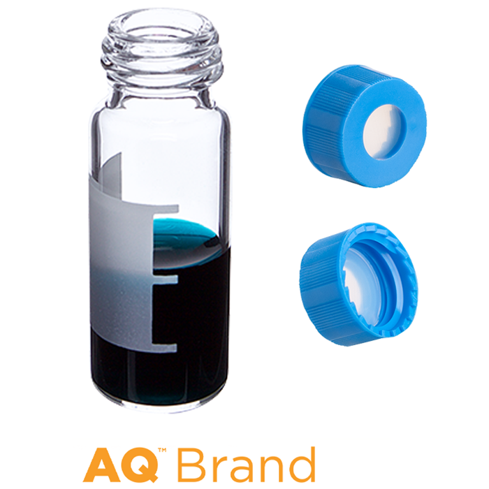 Vial & Cap Kit Includes 100 EA 2ml, Screw Top, Clear Autosampler Vials with Write-On Patch and 100 EA matching Screw Caps with Clear Silicone Rubber / Clear PTFE, ultra-pure Septa, fitted in the Light Blue Caps. AQ Brand Easy Purchase Pack. 1PK