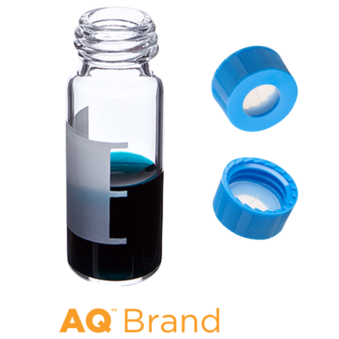 Vial & Cap Kit Includes 100 EA 2ml, Screw Top, Clear Autosampler Vials with Write-On Patch and 100 EA matching Screw Caps with Clear Silicone Rubber / Clear PTFE, Pre-Slit, ultra-pure Septa, fitted in the Light Blue Caps. AQ Brand Easy Purchase Pack. 1PK