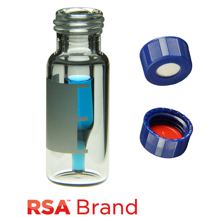 Vial & Cap Kit Includes 100 EA 300ul, Fused Insert, Screw Top, Clear Autosampler Vials with Write on Patch and fill lines and 100 EA matching Screw Caps with White Silicone Rubber / Red PTFE Pre-Slit Soft-Guard Septa, fitted in the Blue Caps. RSA Brand Easy Purchase Pack. 1 PK.