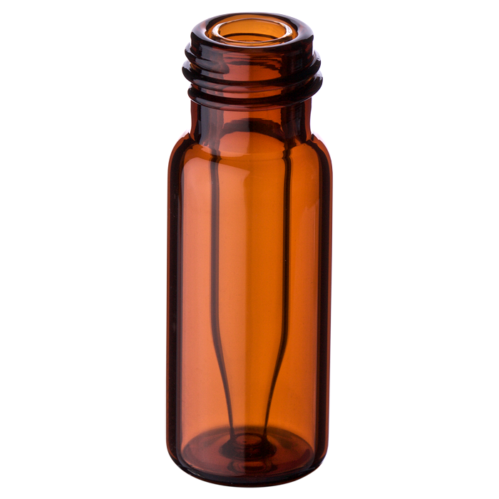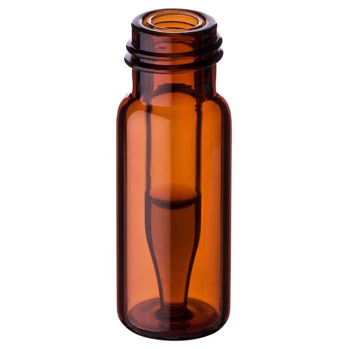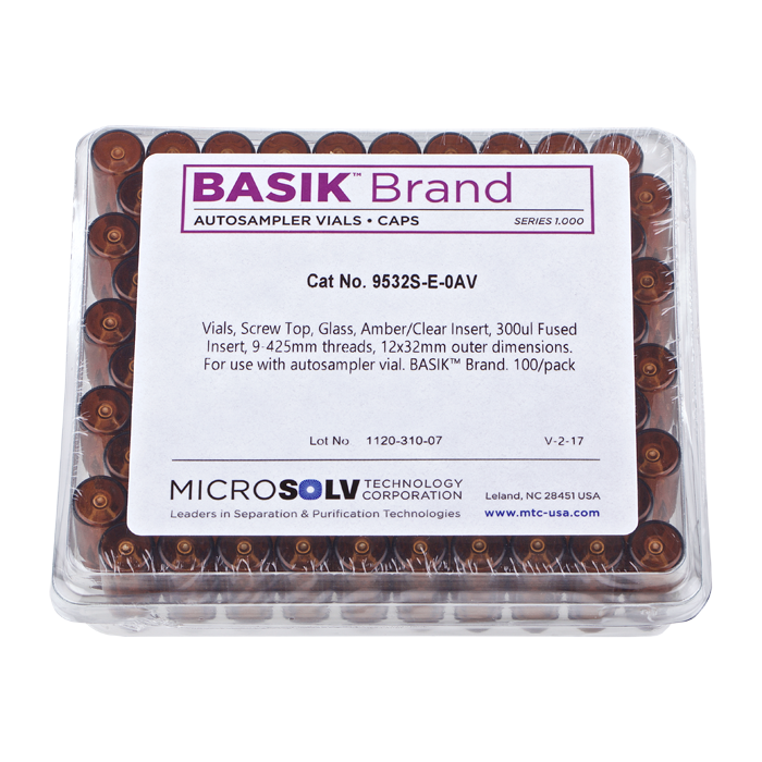 Vials, Screw Top, Glass. Amber / Clear Insert, 300ul Fused Insert, 9-425mm threads, 12x32mm outer dimensions. For use as an autosampler vial. BASIK Brand. 100/PK.