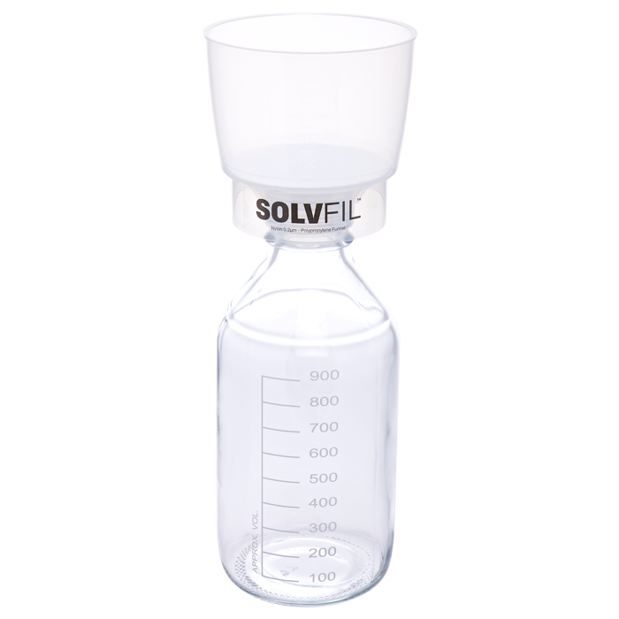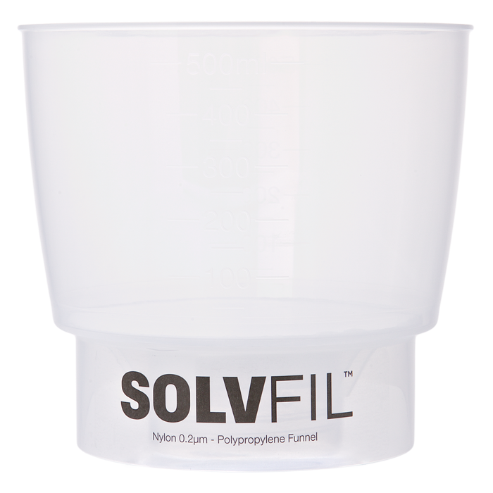SOLVFil™ 500 is constructed as a disposable, single piece filtration device from high purity, FDA grade polypropylene which eliminates solvent leaking and spills with virtually no extractables and chemically inert. The fill reservoir has a 1/2 liter (500ml) capacity and a 90mm diameter filtration area making filtration much faster than traditional 47mm methods and easier and safer. The GL45 Thread matches our Mobile Phase Reservoir Bottles and includes a Y connector for the vacuum line.