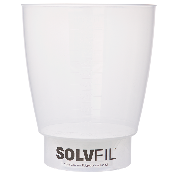 SOLVFil™ 1000 is constructed as a disposable, single piece filtration device from high purity, FDA grade polypropylene which eliminates solvent leaking and spills with virtually no extractables and chemically inert. The fill reservoir has a 1 liter (1,000ml) capacity and a 90mm diameter filtration area making filtration much faster than traditional 47mm methods and easier and safer. The GL45 Thread matches our Mobile Phase Reservoir Bottles and includes a Y connector for the vacuum line.