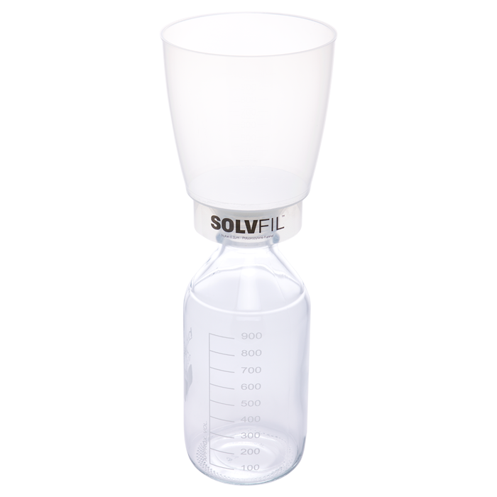 SOLVFil™ 1000 is constructed as a disposable, single piece filtration device from high purity, FDA grade polypropylene which eliminates solvent leaking and spills with virtually no extractables and chemically inert. The fill reservoir has a 1 liter (1,000ml) capacity and a 90mm diameter filtration area making filtration much faster than traditional 47mm methods and easier and safer. The GL45 Thread matches our Mobile Phase Reservoir Bottles and includes a Y connector for the vacuum line.