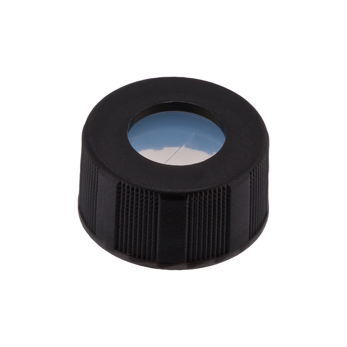 Caps, Screw Top, with Silicone Rubber / PTFE, ultra-pure, Pre-Slit Septa, fitted in knurled, polypropylene, Black Caps. For use with 9-425mm thread, 12x32mm autosampler vials. AQR Brand. 100/PK.