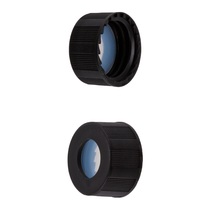 The AQR Brand, matching Black Screw Caps have the most inert Clear, Silicone Rubber / Clear PTFE fitted Septa available; for total Vial and Cap inertness. This Kit is often chosen for maximum sample recovery of proteins, peptides, enzymes, natural products & unknowns especially when working in parts per billion with LCMS or HPLC.