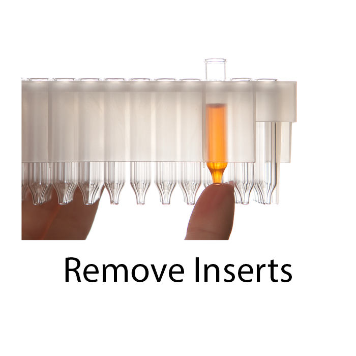 The individual Inserts can be removed from the “RACK” and placed in an AQ™ Brand or RSA™ Brand 2ml, vial and capped for individual sample analyses or storage.