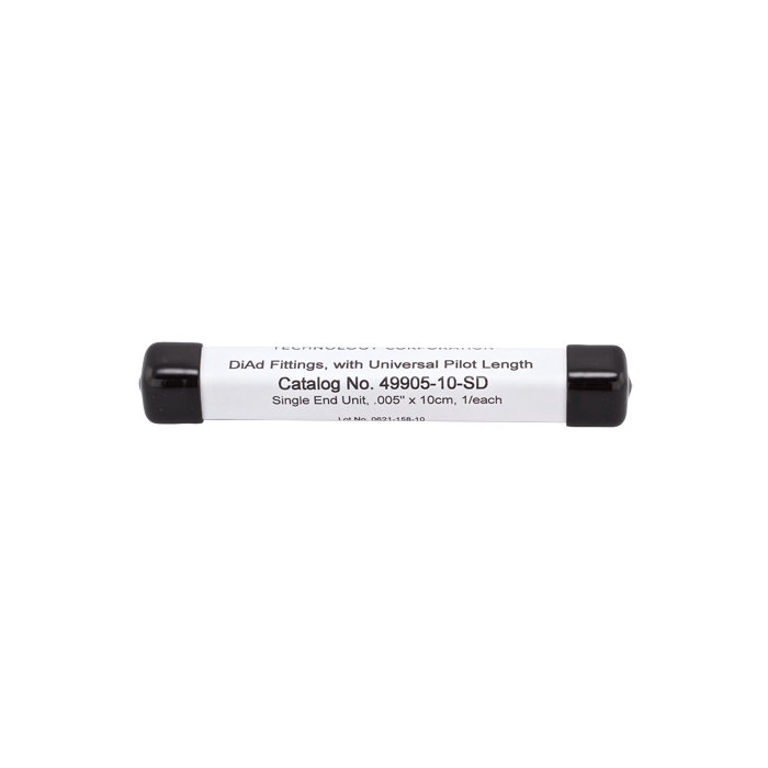 This Di-Ad™ is very convenient for laboratories that use multiple column brands and want to use 0.005" (127um) ID x 100mm (3.94") long tubing with perfect cut tips. Pressure rating for these connectors is 10,000 psi and are HPLC solvent resistant.