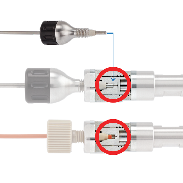 These fittings are easily installed between the injector and the column and between the detector and the outlet side of your column. Then, simply screw the spring loaded end Di-Ad fittings into your column and the tubing pilot length will automatically be adjusted for a tight seal without any void volume. These fittings, with laser cut tubing, replaces the tubing and ordinary male nuts with ferrules or finger tight fittings already in use replacing the need to reset the ferrule swaged on the tubing each time you change column brands.