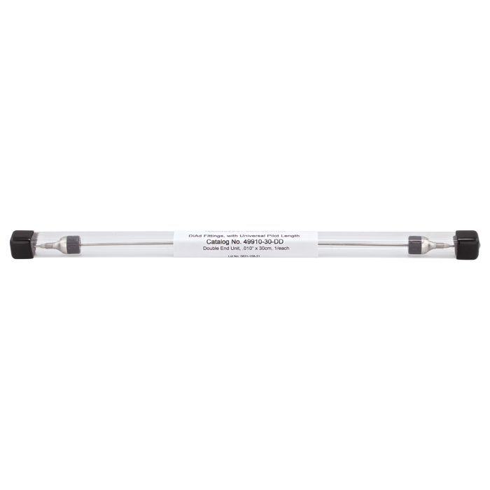This Di-Ad™ is very convenient for laboratories that use multiple column brands and want to use 0.010" (254um) ID x 300mm (11.81") long tubing with perfect cut tips. Pressure rating for these connectors is 10,000 psi and are HPLC solvent resistant.